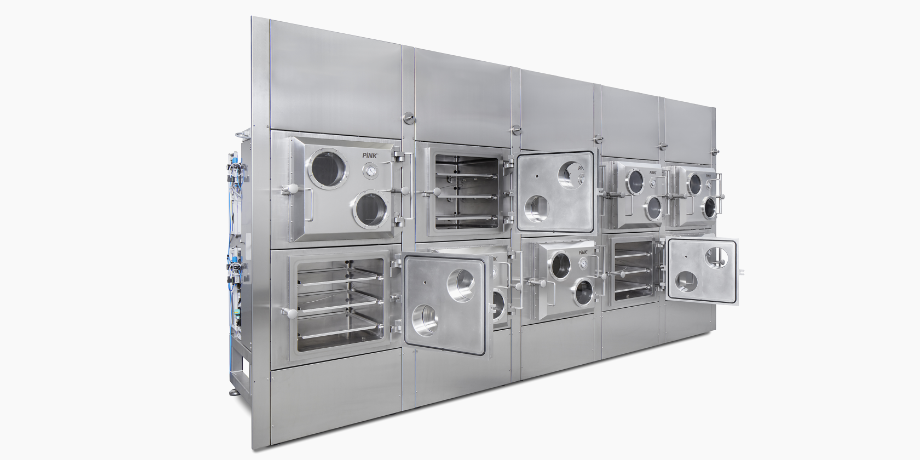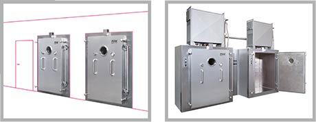 In Durchreiche-Ausführung mit Schleusenfunktion zwischen Reinraum und Grauraum. Die Chargierung erfolgt mittels Beschickungsgestell